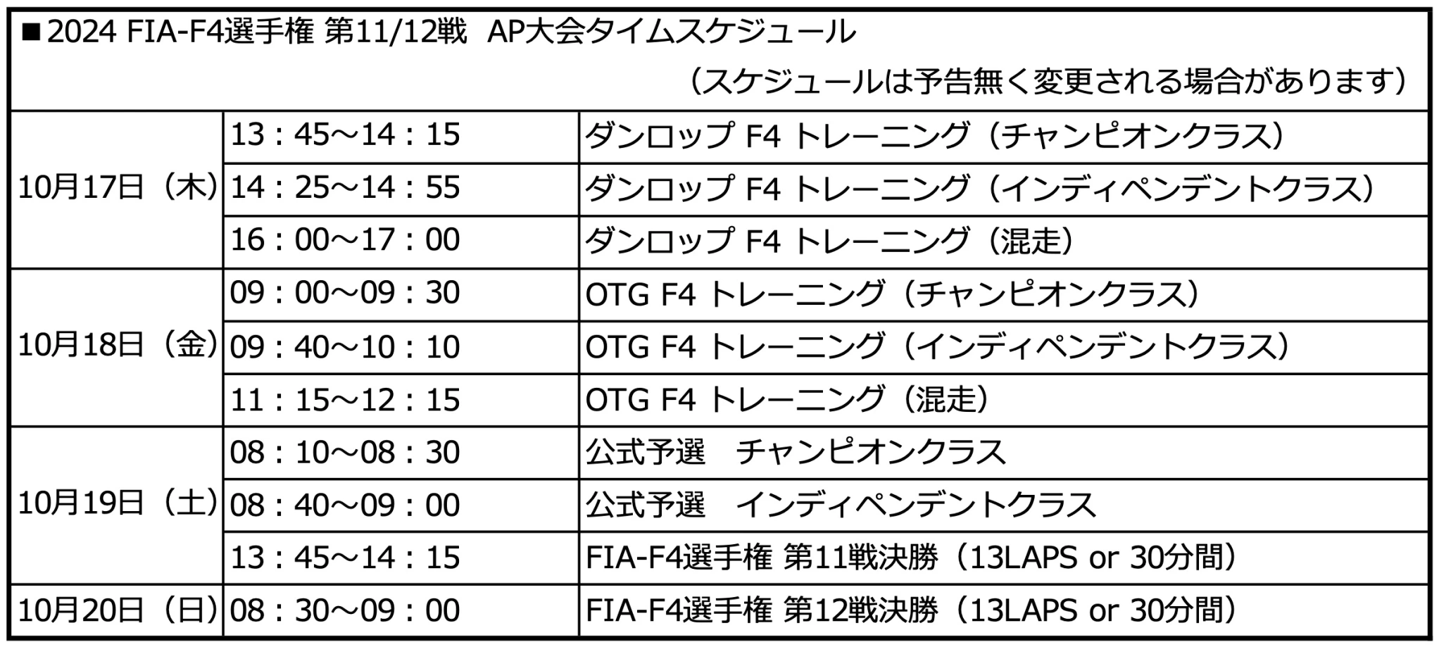 第12戦 公式予選正式結果表(天候不良のためキャンセルとなりました)